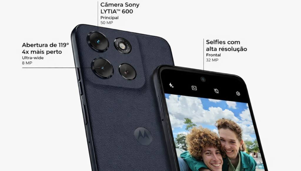 O Moto g56 5G conta com uma configuração de câmeras traseiras avançada. Ela inclui uma câmera principal de alta resolução, uma ultra-wide e uma de profundidade. Essa combinação permite ao usuário capturar desde paisagens amplas até detalhes minuciosos.